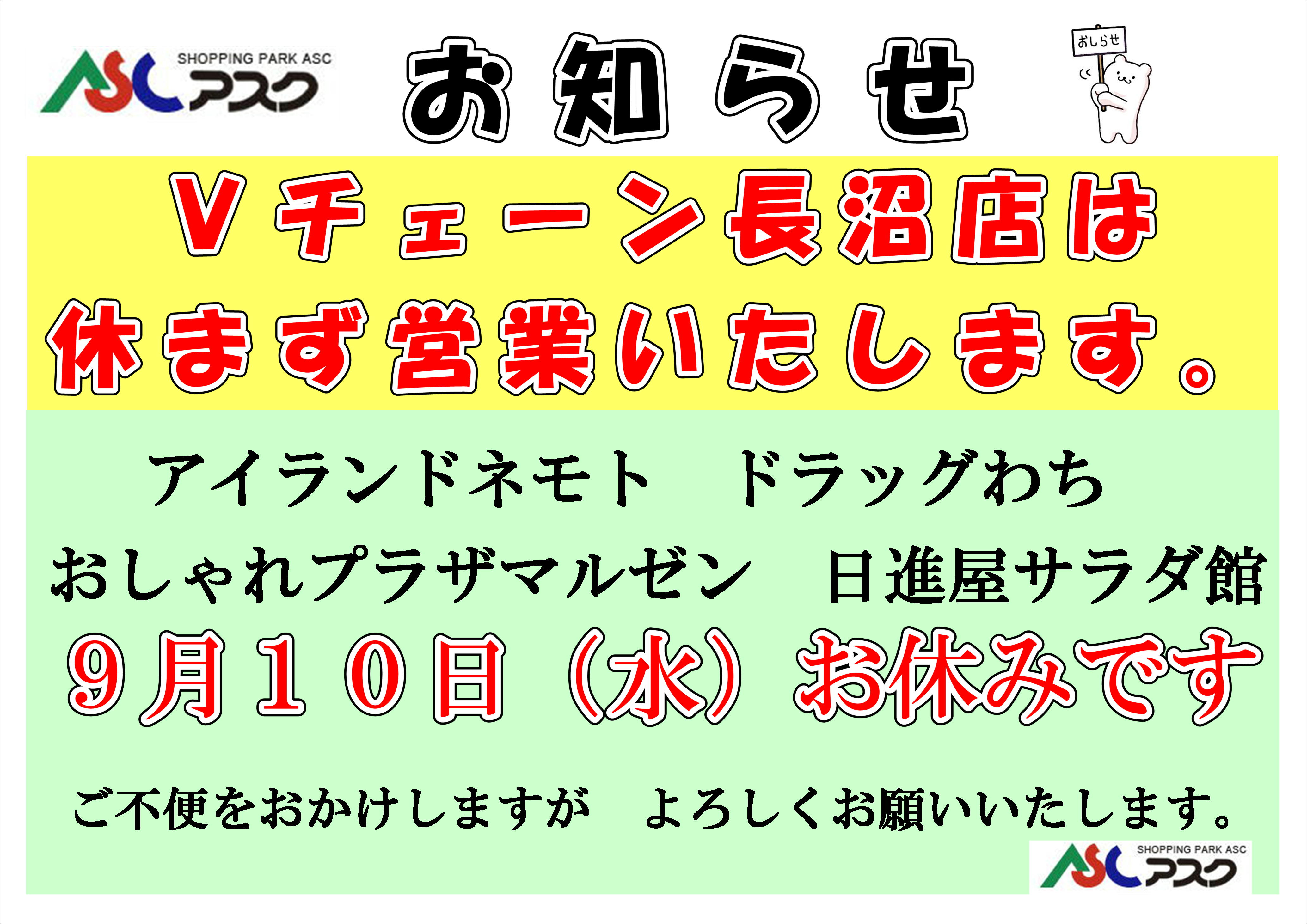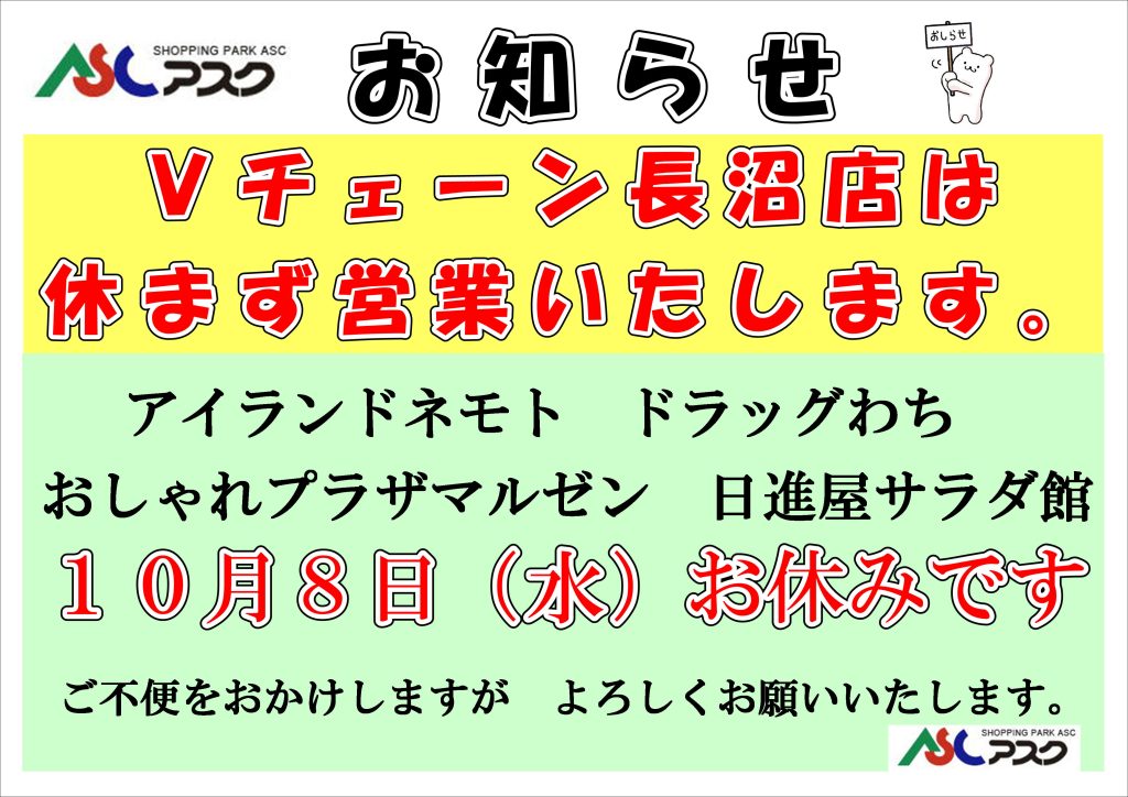 10月8日(水)アスクテナントは定休日でございます Vチェーン新長沼店は営業いたしますので ご利用お待ちしております