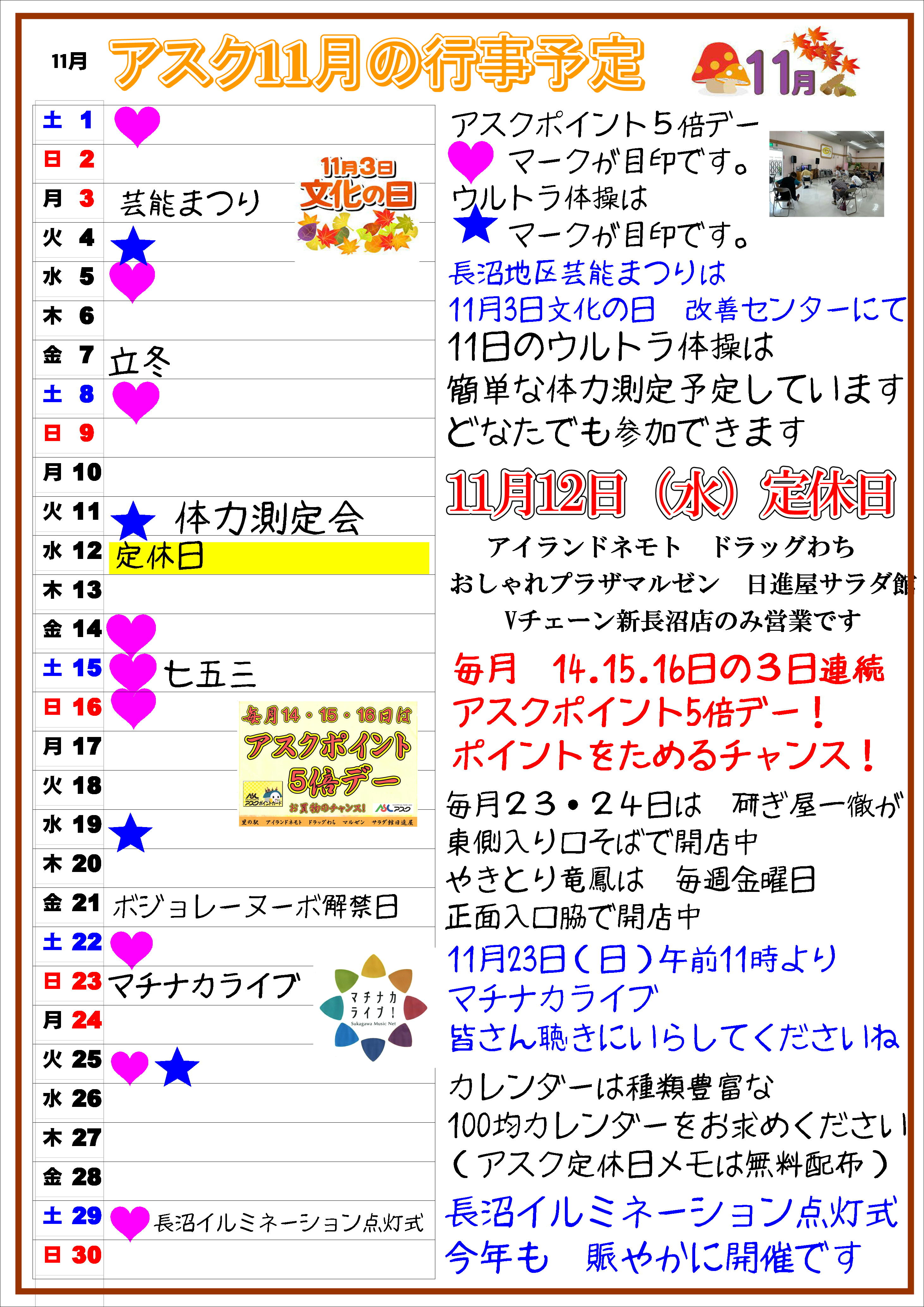 アスクの11月の予定です 変更の場合はそのつど店内掲示板でご案内たします