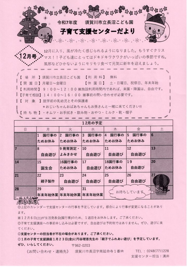 長沼こども園 子育て支援センターだより 12月号のご紹介