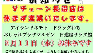 ニュース&イベント 3月11日(水)アスクテナントは定休日でございます Vチェーン新長沼店は休まず営業いたしますのでご利用お待ちしております